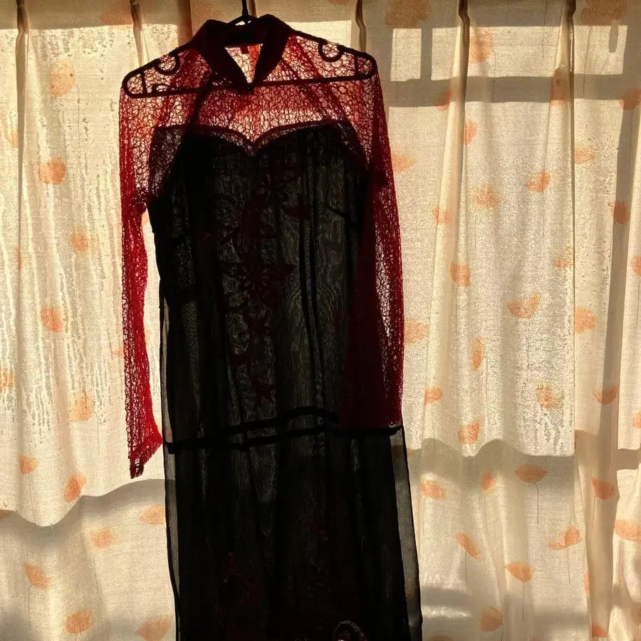 블랙과 빨간색 레이스로 만들어진 자수 차이나 드레스, 긴팔과 스탠드 카라가 특징. - 색상: 블랙과 빨간색 레이스 - 디자인: 자수 차이나 드레스 - 장식: 비즈와 플라워 모티브 자수 - 소매: 긴팔 - 옷깃: 스탠드 카라 L 사이즈 방문해 주셔서 감사합니다. 사이즈 - L