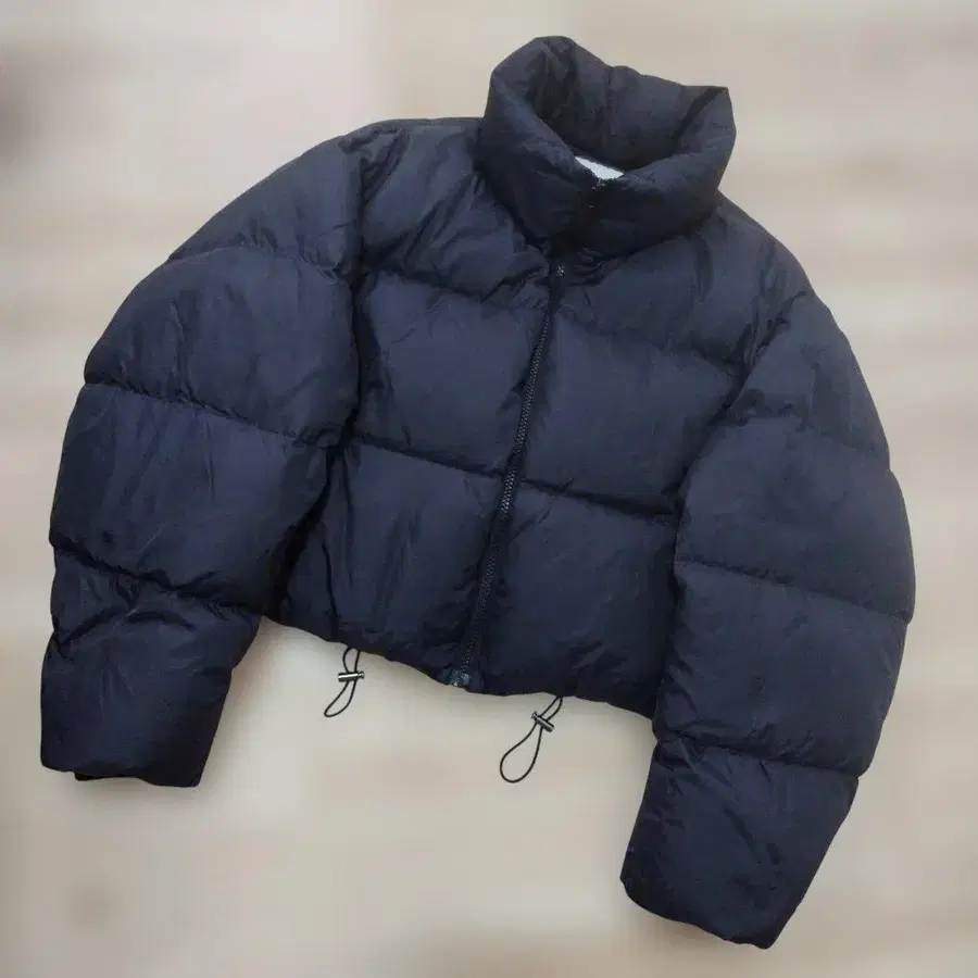 ※ 프론트 지퍼와 드로우 스트링이 달린 숏 기장 블랙 다운 자켓.