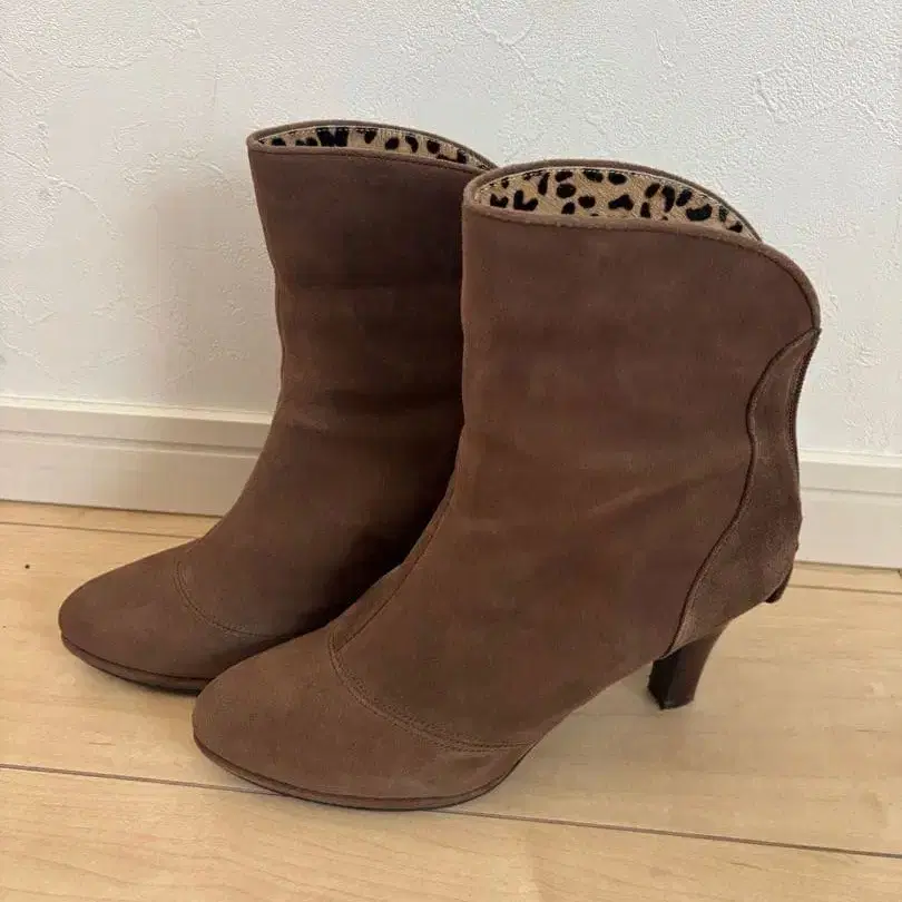 브라운 스웨이드 부츠, 레오파드 무늬 안감, 사이드 지퍼 부착, 힐 약 7cm.