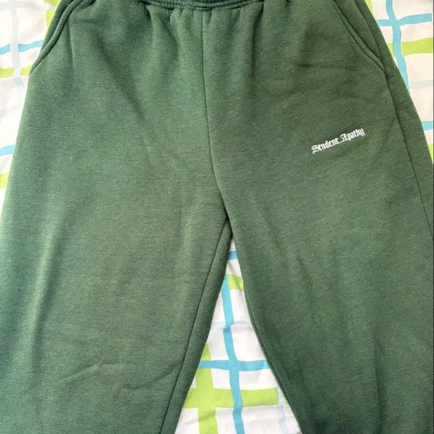 그린 색상의 스웨트 팬츠로, 프론트에 'Student Apathy' 자수가 있습니다.