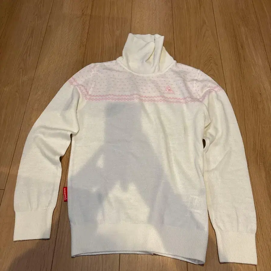 화이트 터틀넥 셔츠, 핑크 무늬, 아크릴과 울 혼합 소재.