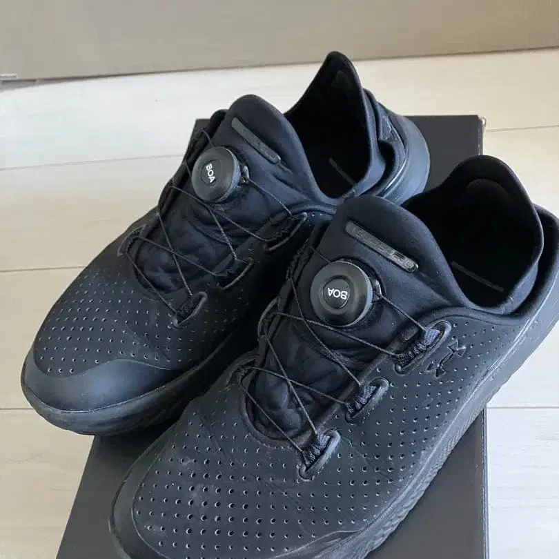 BOA 다이얼 시스템이 탑재된 블랙 스니커즈. - 모델명: UA Slipspeed Trainer NB - 사이즈: 27cm (US M9/W10.5) - 색상: 블랙 - 밑창: 특수 패턴의 러버 솔 - 특징: BOA 다이얼 시스템 방문해 주셔서 감사합니다.