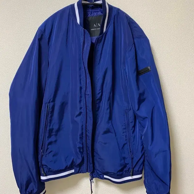자동 번역되었어요. 원문보기나일론 소재의 네이비 MA-1 자켓, Armani Exchange 로고 포함.