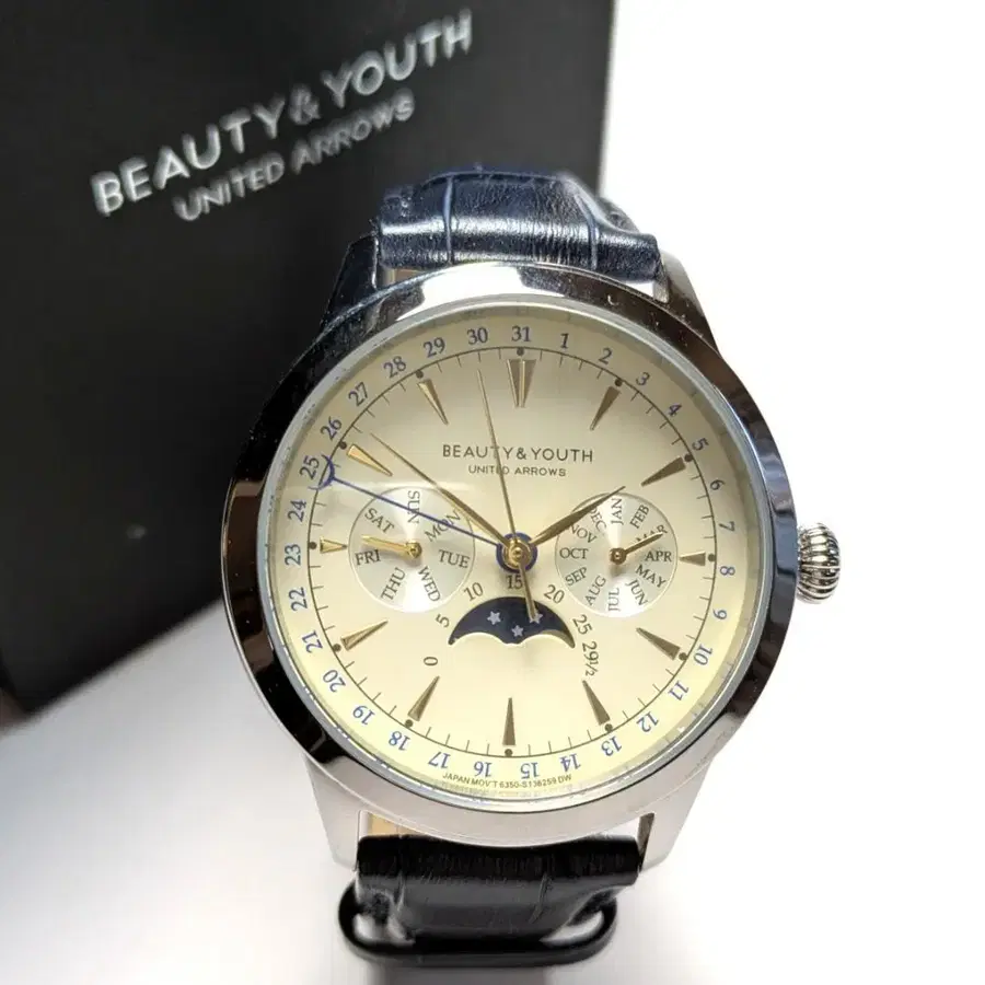 BEAUTY&YOUTH UNITED ARROWS 뷰티&유스 유나이티드 애로우즈 미사용 손목시계 [ 모델 ] 문페이즈 [ 색상 ] 다이얼: 베이지, 벨트: 네이비 [ 사이즈 ] 케이스 40mm x 케이스 두께 11.5mm [ 소재 ] 스테인리스 x 카프 가죽 [ 무브먼트 ] 쿼츠 [ 내수압 ] 100m [ 부속품 ] 전용 박스 케이스, 사용 설명서 겸 보증서 (기재 없음) [ 상태 ] 벨트에 노후화가 있습니다. 제가 판매하는 모든 상품은 정품입니다. 안심하고 구매하세요. 데미지 등은 최대한 기재하겠지만, 간혹 놓치거나 보관 시 생긴 스크래치 등이 있을 수 있습니다. 이해해 주시면 감사하겠습니다.