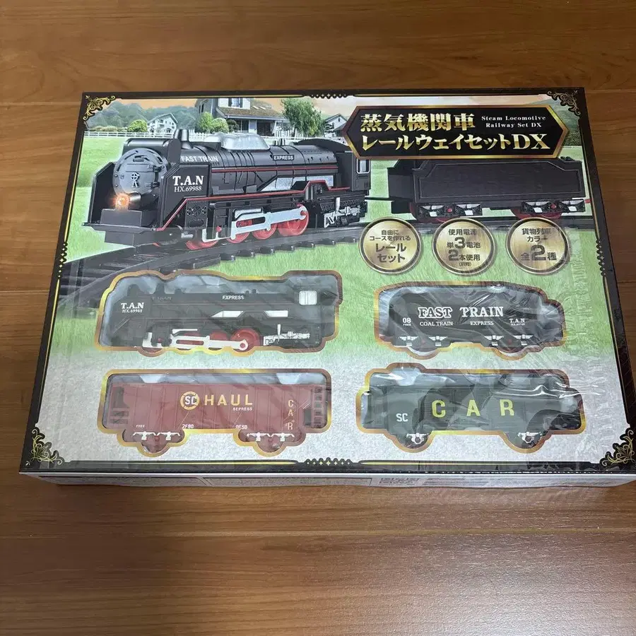 - 세트 내용: 증기기관차, 화물차 2량, 레일 260cm, 160cm, 130cm