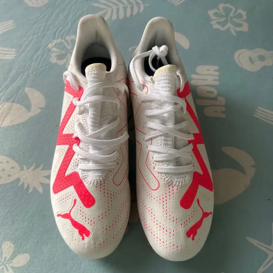 경량 메쉬 소재의 화이트와 핑크 축구화.