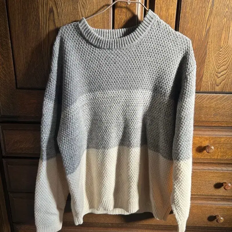 그레이와 화이트의 그라데이션이 특징인 캐주얼 니트 스웨터. - 색상: 그레이와 화이트의 그라데이션 - 디자인: 크루넥, 뜨개질 무늬 - 소재: 니트 - 스타일: 캐주얼 방문해 주셔서 감사합니다. 사이즈 - M