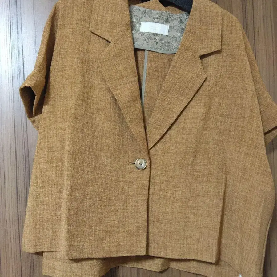린넨풍 브라운 테일러드 자켓, 싱글 버튼, 반팔 디자인. - 색상: 브라운 계열의 오렌지 - 디자인: 테일러드 자켓 - 버튼: 싱글 버튼 - 소매: 반팔 - 소재: 린넨풍 원단 총길이 약 56cm 방문해 주셔서 감사합니다.