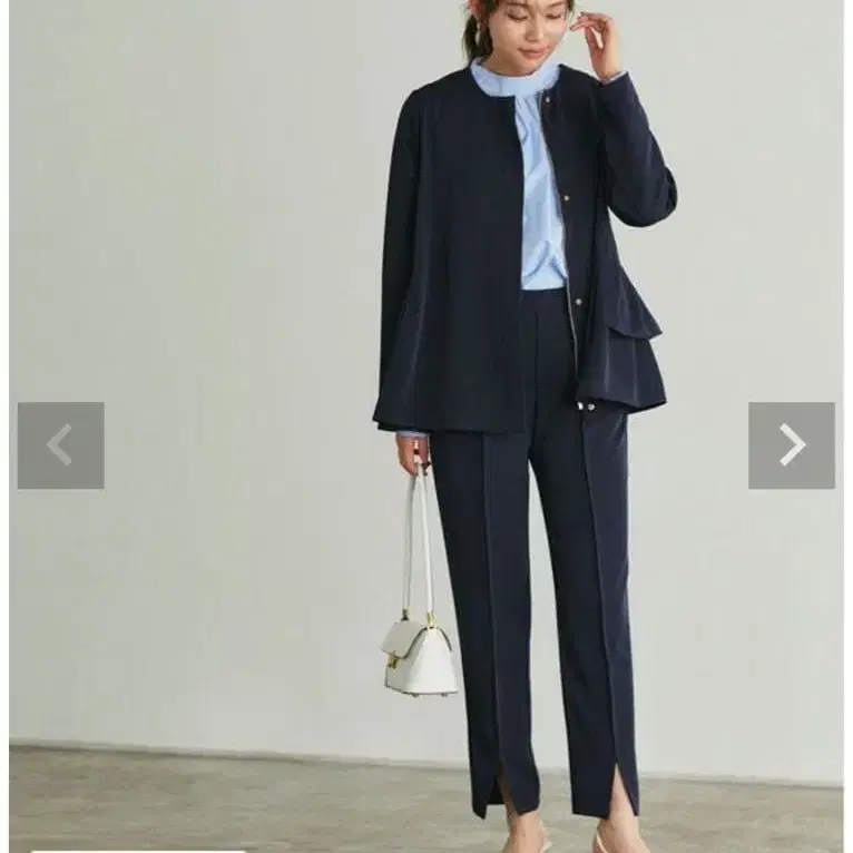 아우터는 백 프릴 디자인으로 깔끔해 보이는 실루엣이 매력입니다. 지퍼 사양으로 입고 벗기 편합니다. 하의는 센터 밑단에 슬릿을 넣어 롱 레그 효과와 슬림해 보이는 연출을 합니다.
