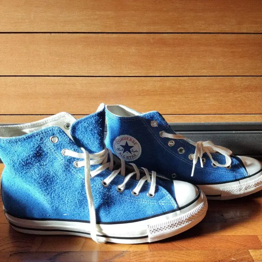 파란색 스웨이드 소재의 컨버스 스니커즈, 하이컷 스타일.