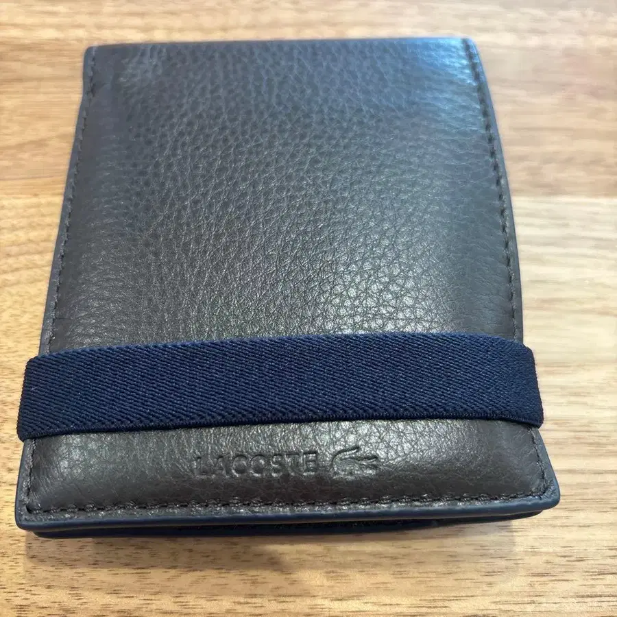 라코스테의 반지갑입니다. 색상은 브라운이며, 밴딩이 달려 있습니다. 지폐 수납 공간은 칸막이로 2개로 나뉘어 있습니다.