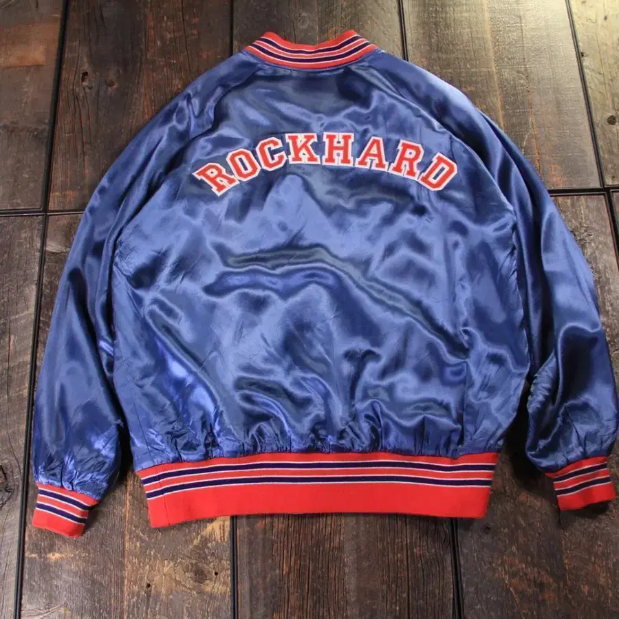 구제 의류 광택 바시티 자켓 락 하드 래글런 슬리브 NY 블루 JP; L