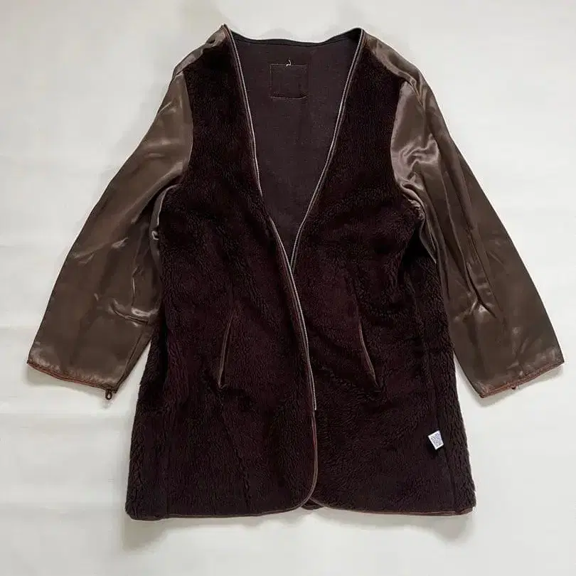 플리스와 새틴의 콤비네이션이 특징인 다크 브라운 롱 코트. 라이너 코트입니다. 구제샵 구매. - 색상: 다크 브라운 - 소재: 플리스와 새틴 - 스타일: 롱 코트 - 소매 디자인: 새틴 긴팔 - 안쪽 디자인: 플리스 소재 안감 방문해 주셔서 감사합니다. 사이즈 - FREE SIZE