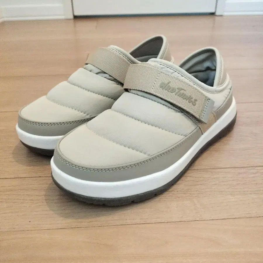 스트랩이 달린 베이지색 슬립온, 쾌적한 착용감.