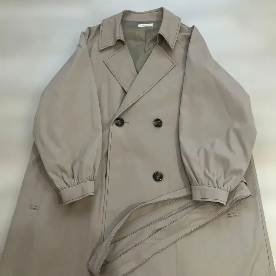 베이지 더블 브레스트 트렌치코트, 벌룬 슬리브 디자인.