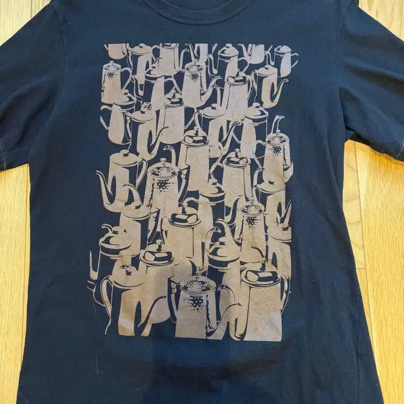 찻주전자 그래픽이 특징인 블랙 티셔츠. - 브랜드: ISSEY MIYAKE - 디자인: 찻주전자 그래픽 - 색상: 블랙 - 소매 스타일: 스트레이트 소매 방문해 주셔서 감사합니다. 기장 65cm, 가슴 너비 49cm입니다. 그래픽 부분은 브라운 색상이지만, 빛의 관계로 실제와 가까운 색상의 사진을 찍지 못했습니다. 다소 밝게 나왔습니다. 실제로는 블랙 베이스에 초콜릿 같은 브라운 색상입니다.