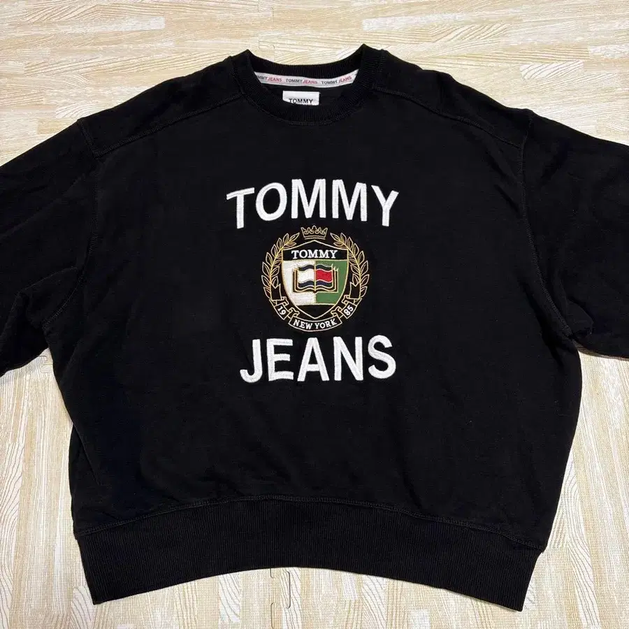 로고 자수가 특징인 블랙 크루넥 트레이닝복.