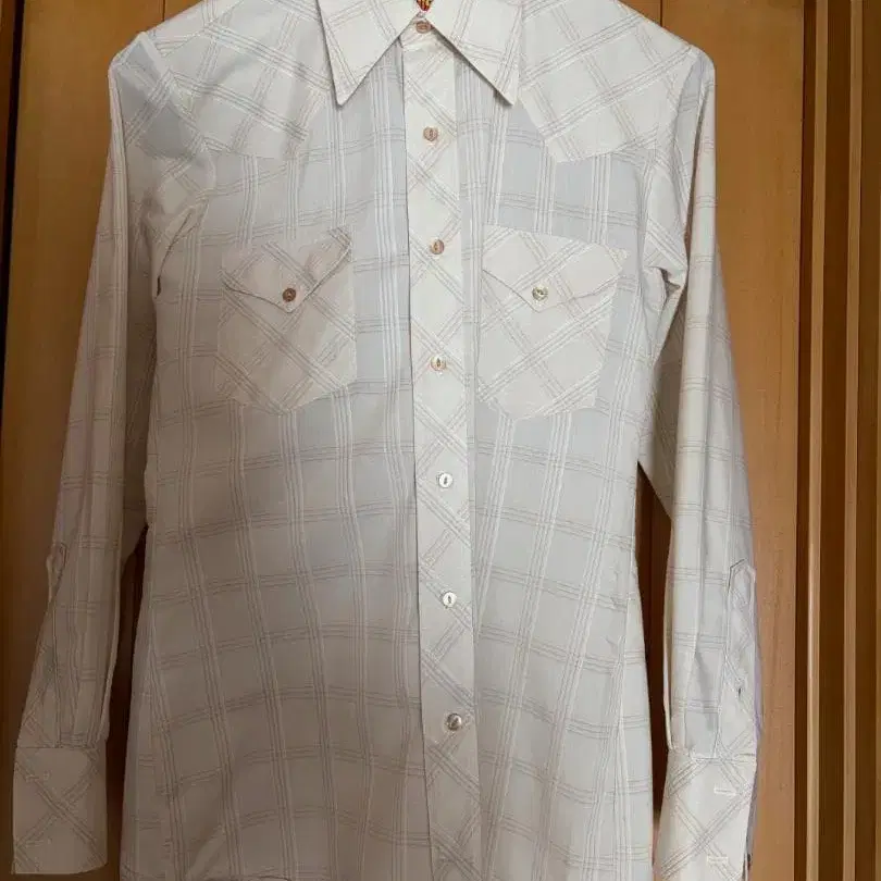 거울 웨스턴 셔츠, 미국제입니다. 화이트 베이스에 옅은 색감의 스트라이프 체크이며, 스냅이 아닌 펄 느낌의 고양이 눈 버튼으로, 수트에 맞춰 입어도 좋을 듯한 드레스 셔츠 스타일입니다. 눈에 띄는 얼룩, 찢김 등은 육안으로 확인한 결과 없었습니다. 폴리에스테르 80%, 면 20% 혼방입니다. 어깨 너비 약 44cm, 가슴 너비 약 52cm, 소매 길이 약 62cm, 뒷면 기장 약 82cm입니다.