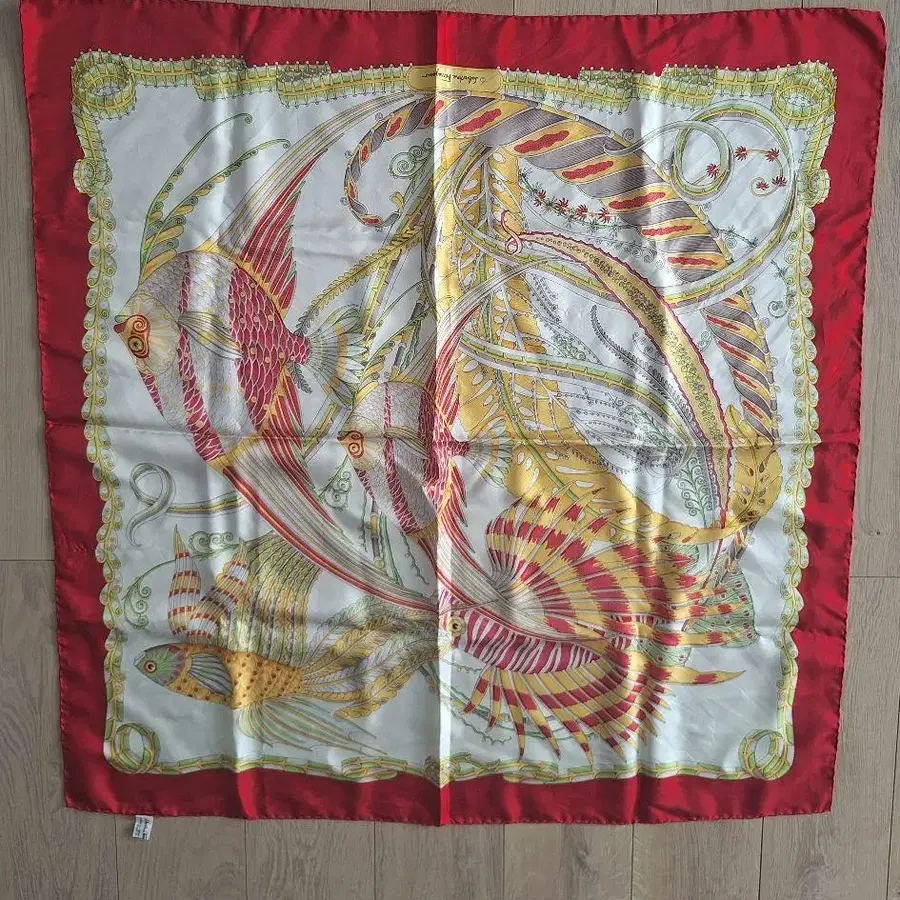물고기 모티브가 특징인 실크 스카프. - 브랜드: Salvatore Ferragamo - 소재: 100% 실크 - 디자인: 물고기 모티브, 빨간색 테두리 - 사이즈: 약 90cm x 90cm 방문해 주셔서 감사합니다. 얼룩, 찢김, 냄새 등 - 없음