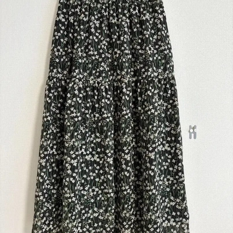 블랙 베이스에 화이트와 그린 꽃무늬가 아름다운 플레어 스커트입니다.