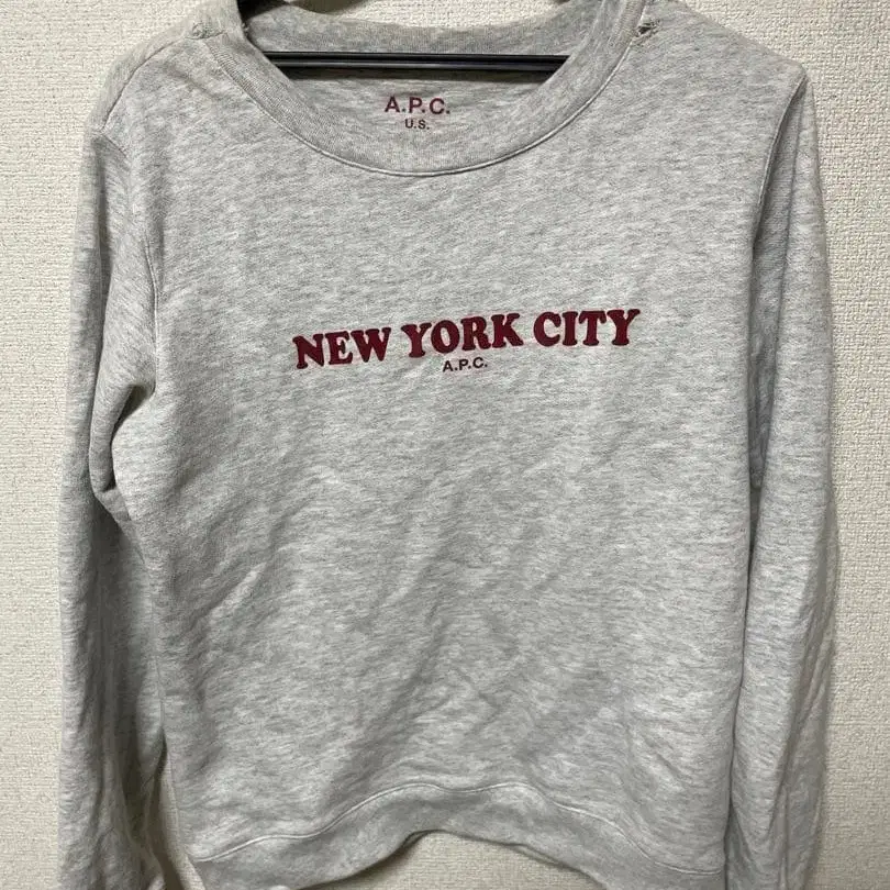 그레이 색상의 A.P.C. 맨투맨, NEW YORK CITY 프린트가 있으며, 짧은 기장으로 유행하는 돌려입기가 가능합니다. 약간의 찢김이 있지만 빈티지 느낌이 나서 좋다고 생각합니다.
