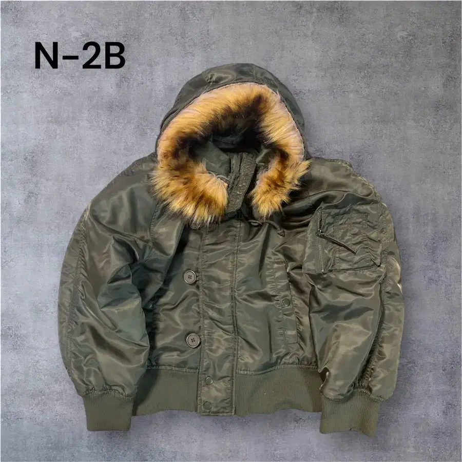 올리브 색상의 N-2B 자켓, 퍼가 달린 후드와 단추식 디자인이 특징. - 모델: N-2B - 색상: 올리브 - 후드: 퍼 포함 - 디자인: 단추식 어깨 너비 53cm 기장 61cm 가슴 너비 61cm 밑단 길이 62cm