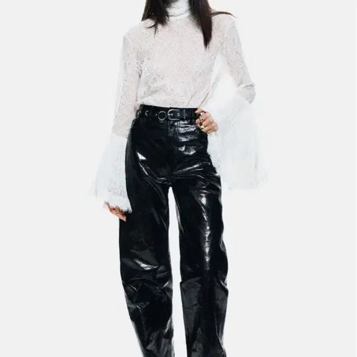 레이스 소재의 화이트 셔츠, 플레어 슬리브 디자인.