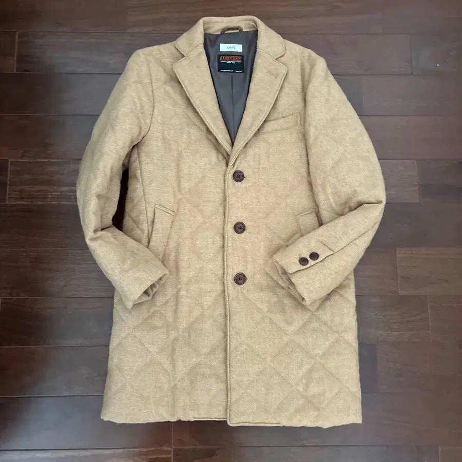 퀼팅 디자인의 베이지 체스터 코트, Thermore 소재로 보온성이 뛰어납니다.