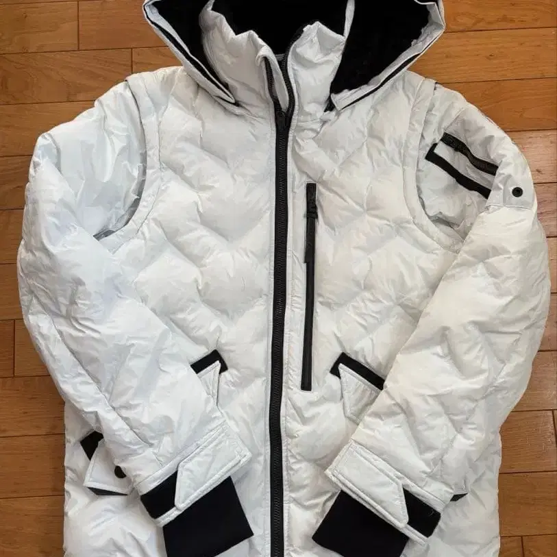 퀼팅 디자인의 화이트 다운 자켓, 플리스 안감으로 뛰어난 보온성.