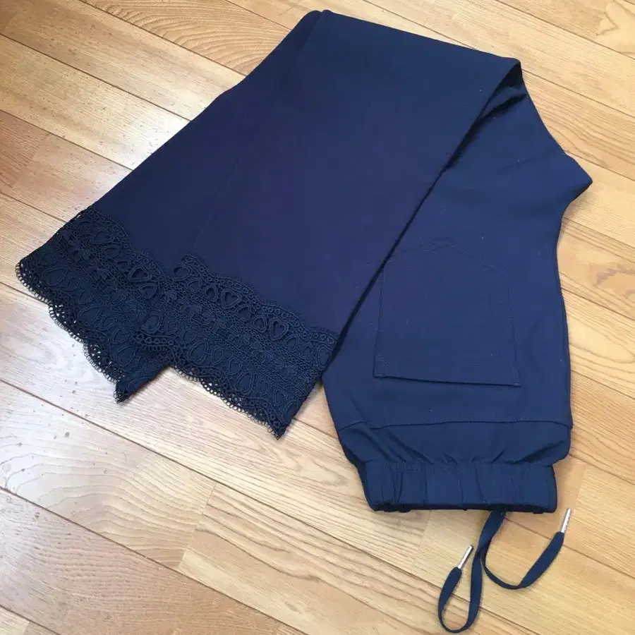 속기모 이지 팬츠 구매했지만 미사용. 밑단이 하트와 리본 레이스 따뜻한 원단 느낌 탄탄한 원단 느낌 허리 끈 포함 스캘럽 색상 - 네이비 계열