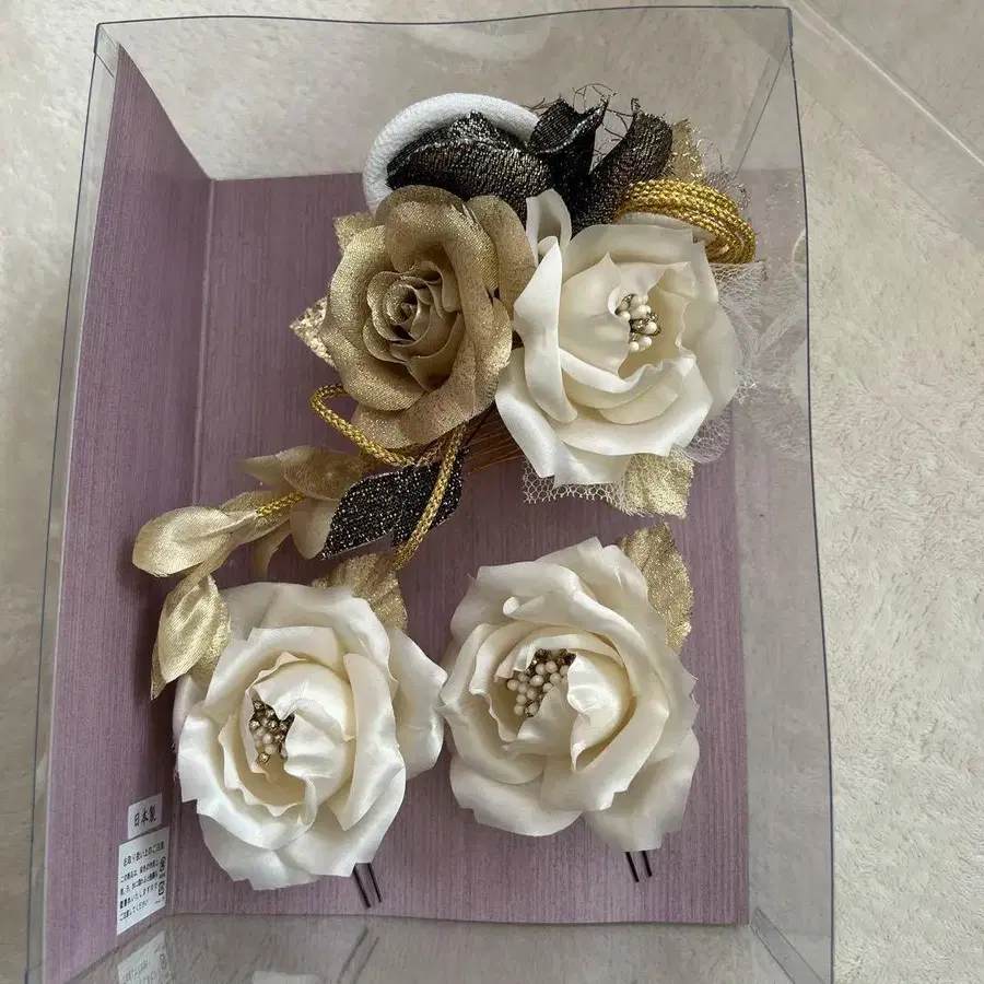 화이트와 골드 꽃 모티브의 헤어 액세서리로, 엘레강트한 디자인이 특별한 날의 스타일을 돋보이게 합니다.