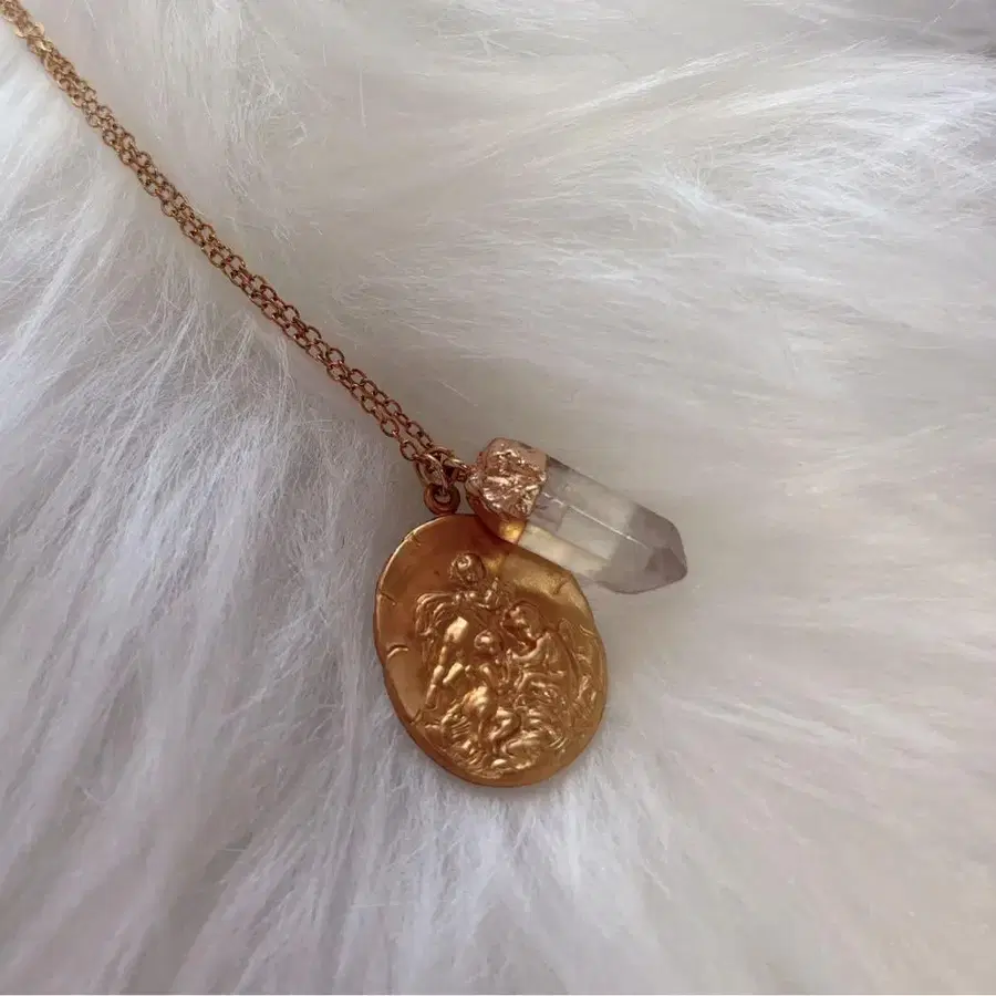 수정과 골드 메달 목걸이. 메달은 세로 약 2.5cm (두께는 거의 없고 가벼움) 수정은 세로 약 2.2cm입니다. - 소재: 놋쇠 - 스톤: 크리스탈 수정 - 조절 없음 질문, 가격 인하 상담 받습니다. 자택 보관이므로 이해해 주시는 분만 부탁드립니다.