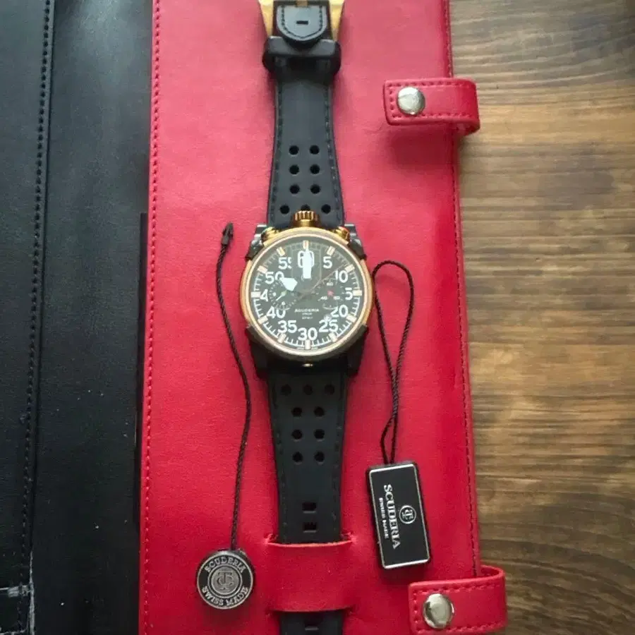 Scuderia Cafe Racer 블랙과 골드 색상의 방수 시계입니다. 실리콘 스트랩 벨트는 사용감이 있지만, 교체용 새 벨트도 함께 드립니다.