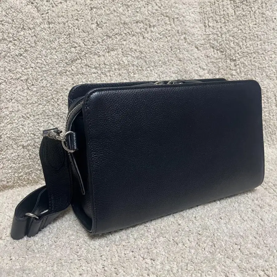 심플하고 스타일리시한 블랙 가죽 숄더백, 더블 지퍼 디자인으로 사용하기 편리합니다.