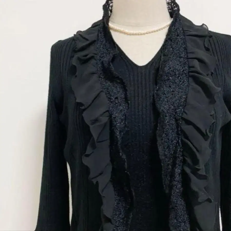 프릴 디자인의 블랙 긴팔 니트 앙상블입니다. - 색상: 블랙 - 디자인: 프릴 포함 - 스타일: 긴팔 - 소재: 니트 방문해 주셔서 감사합니다. 사이즈 - M ※ 장식용 펄 목걸이는 부속물에 포함되지 않습니다.