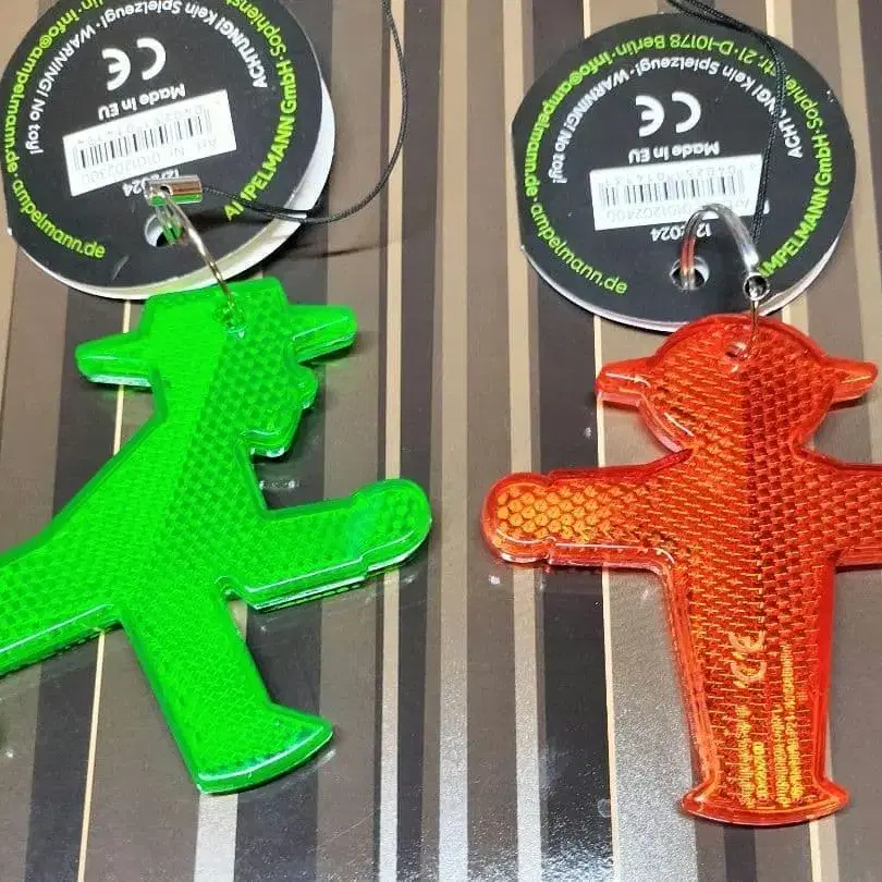 리플렉터 - 반사판 AMPELMANN 앙펠만 페어 키링 독일 베를린의 유명한 신호등 캐릭터 앙펠만의 키링입니다. 그린 컬러와 빨간색 세트입니다. 베를린 앙펠만 샵에서 구매했습니다. 가방이나 열쇠에도 개성 있는 악센트를 더합니다. [ 편리한 스트랩 포함 ] 검은색 스트랩이 부속되어 있어 쉽게 설치할 수 있습니다. 사이즈 약 그린 세로 9cm x 가로 6cm 레드 세로 8cm x 가로 8cm - 색상: 그린, 레드 - 소재: 플라스틱 - 스트랩: 부속 (검은색 끈 포함) - 택: 브랜드 택 포함 레드는 오렌지빛이 도는 레드입니다. 그린, 레드 모두 발밑을 기울이면 글자가 나타납니다. #momo의 독일 상품 보기 레드만, 혹은 그린만 구매 시 1690엔으로 준비해 드립니다.