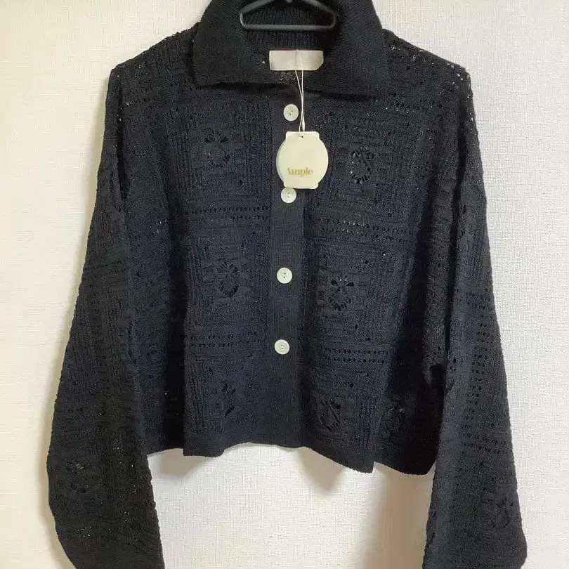 니트 소재의 블랙 크롭 가디건, 화이트 버튼 포함. - 색상: 블랙 - 스타일: 크롭 - 소재: 니트 - 브랜드명: Ample - 버튼 색상: 화이트