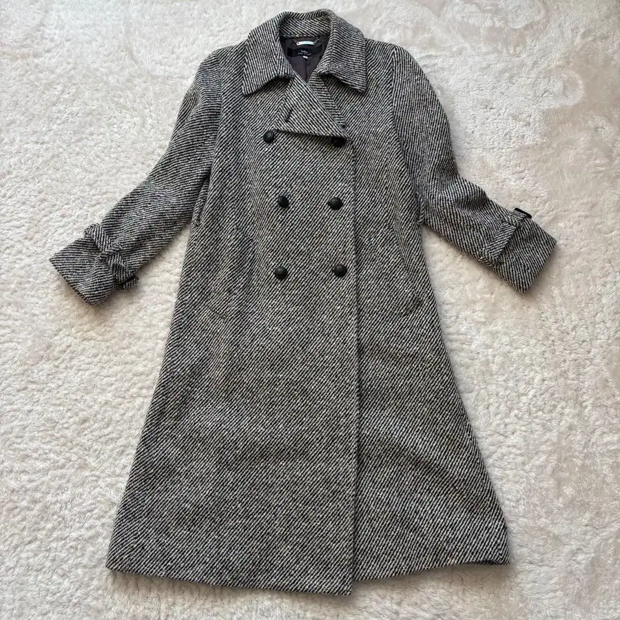 트위드풍 더블 브레스트 롱 코트 롤업 소매 포함. - 색상: 모노톤 - 디자인: 더블 브레스트 - 소재: 트위드풍 - 소매: 롤업 가능 - 스타일: 롱 코트 롱 코트이지만 무겁지 않고 따뜻하게 입으실 수 있습니다. 원단에 약간 변색된 부분이 있습니다. (이미지 10, 11을 확인해주세요) 그 외에는 데미지 없이 매우 깨끗한 상품입니다. 변색 부분은 버튼을 잠그면 보이지 않습니다. 원단도 패턴 제품이라 눈에 띄지 않지만 신경 쓰이는 분은 구매를 자제해주세요. 방문해 주셔서 감사합니다. 사이즈 - L