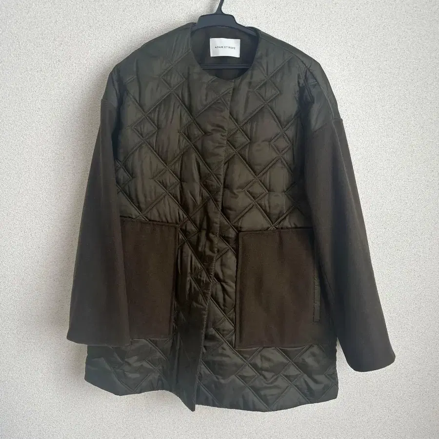 올리브 색상의 다이아몬드 퀼팅 자켓, 울 혼방 소재로 따뜻함을 제공합니다. - 브랜드: ADAM ET ROPE - 색상: 올리브 - 스타일: 퀼팅 자켓 - 소재: 겉감: 나일론, 안감: 울 - 디자인: 다이아몬드 퀼팅 - 포켓: 앞면에 큰 포켓 있음 방문해 주셔서 감사합니다.