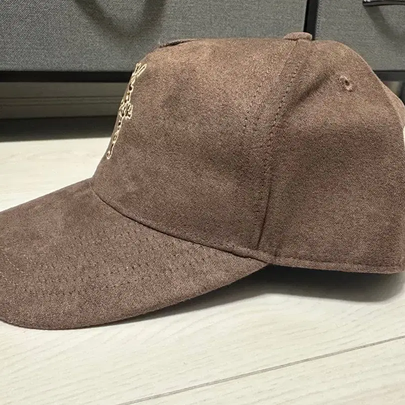 스웨이드 소재의 브라운 캡, Travis Scott 자수 로고 포함.