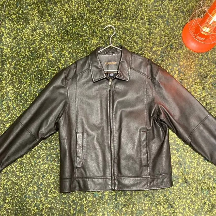 심플하고 스타일리시한 블랙 가죽 자켓, L 사이즈. 1년 전 나가노현의 구제 의류 매장에서 약 27,000엔에 구매하여 2회 정도 착용했습니다.