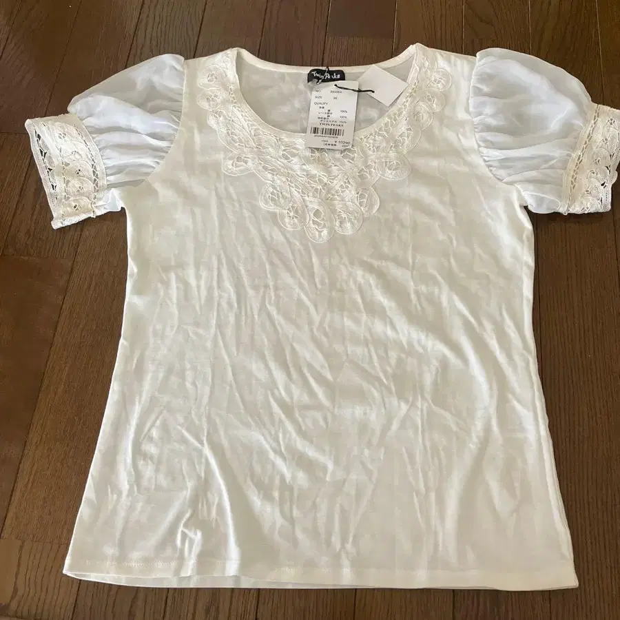 자수가 들어간 넥라인과 프릴 소매가 특징인, 코튼 100% 반팔 T셔츠.