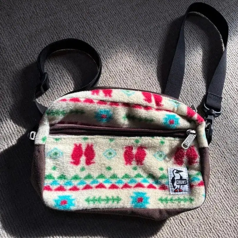 플리스 원단의 멀티 컬러 디자인, 조절 가능한 숄더 스트랩이 달린 숄더백. 현재는 판매되지 않는 레어 아이템입니다.