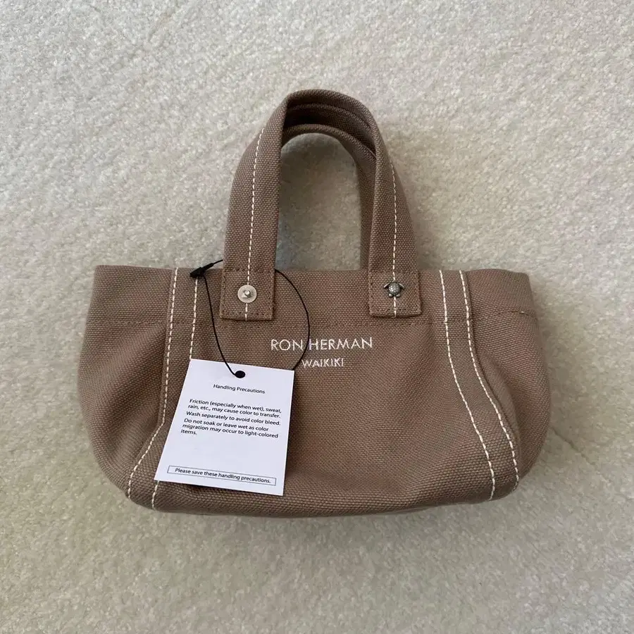 베이지 색상의 미니 토트백, 흰색 스티치가 특징입니다.