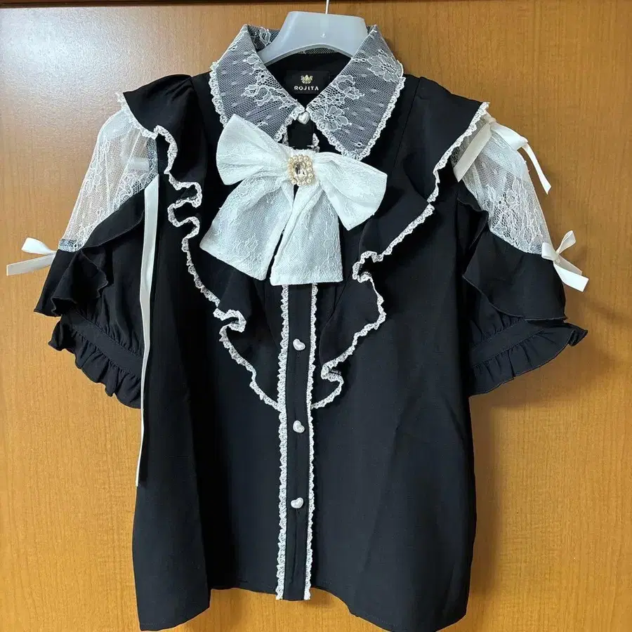 ROJITA 블랙 반팔 블라우스 레이스 프릴