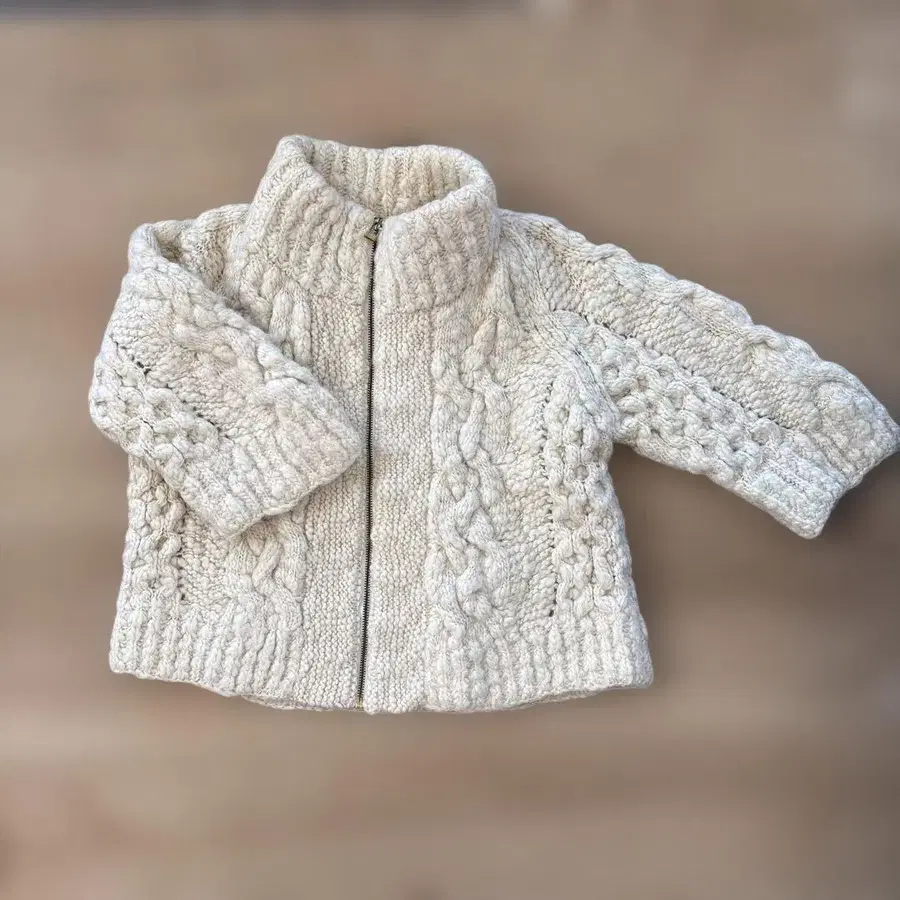 자동 번역되었어요. 원문보기아이보리 색상의 케이블 니트 디자인, 프론트 지퍼가 달린 BACCA 브랜드의 긴팔 스웨터입니다.