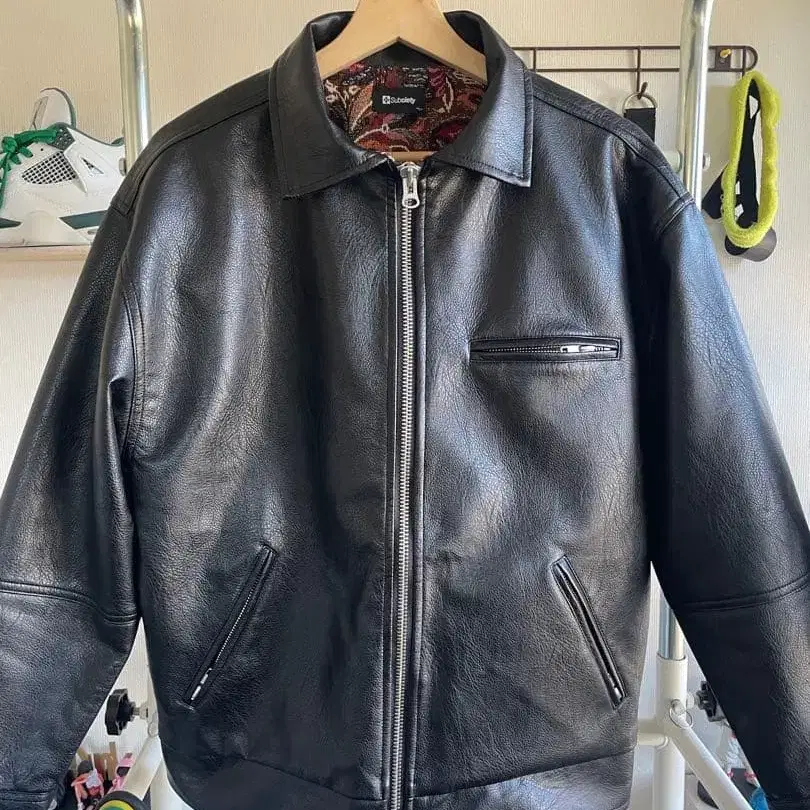 자동 번역되었어요. 원문보기블랙 가죽 자켓, 페이즐리 무늬 안쪽 디자인.