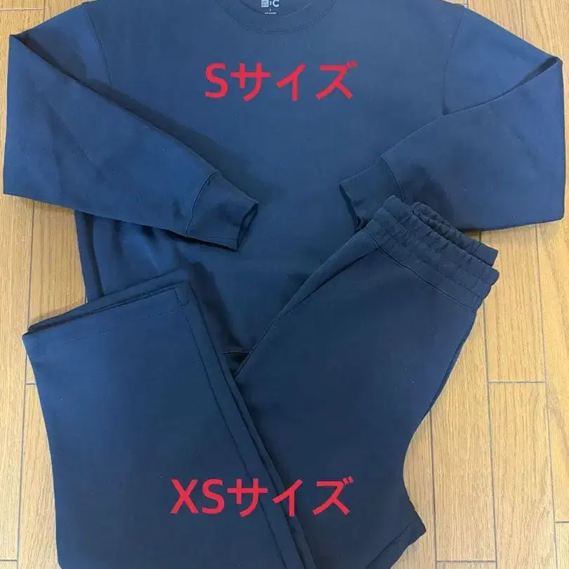 유니클로 C 맨투맨 셋업입니다. 겉옷은 S 사이즈, 바지는 XS 사이즈입니다. 2025년 12월 말 구매 색상은 네이비입니다. 잘 부탁드립니다.