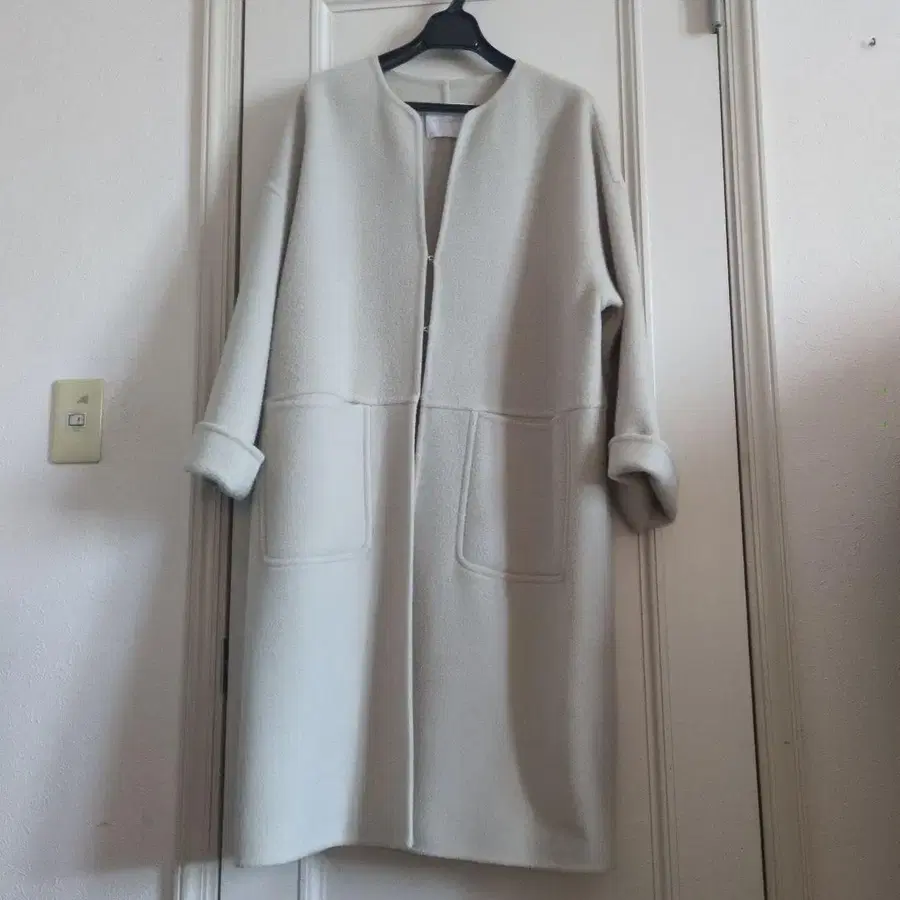 크림색의 프론트 후크 롱 코트, 두 개의 포켓이 있어 실용적입니다.
