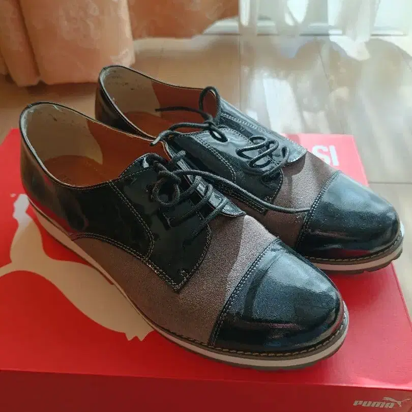 블랙과 그레이의 투톤 컬러, 합성 피혁과 스웨이드의 레이스업 슈즈. - 색상: 블랙과 그레이의 콤비네이션 - 소재: 합성 피혁과 스웨이드 - 스타일: 레이스업 슈즈 - 밑창: 러버 솔 - 디자인: 투톤 컬러 디자인 - 상태: 눈에 띄는 흠집은 없습니다. - 사이즈: 24cm 방문해 주셔서 감사합니다.